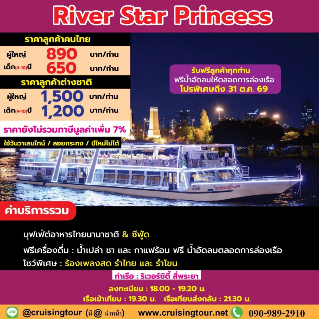 เรือ ริเวอร์ สตาร์ ปริ้นเซส River Star Princess ล่องเรือเจ้าพระยา ล่องเรือสุดโรแมนติก ชมบรรยากาศสองฝั่งเจ้าพระยา ทานดินเนอร์หรู บุฟเฟ่ต์นานาชาติ ซีฟู้ด เครื่องดื่มฟรี น้ำเปล่า ชา กาแฟ น้ำอัดลมฟรี 2 ชั่วโมง การแสดง ดนตรีสดบนเรือ รำโขน ลำไทย